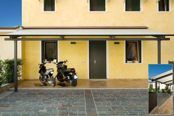 Richiesta del cliente: Creazione di una copertura per auto e motoveicoli, con funzione di protezione della zona di ingresso, esteticamente leggera ed integrata.